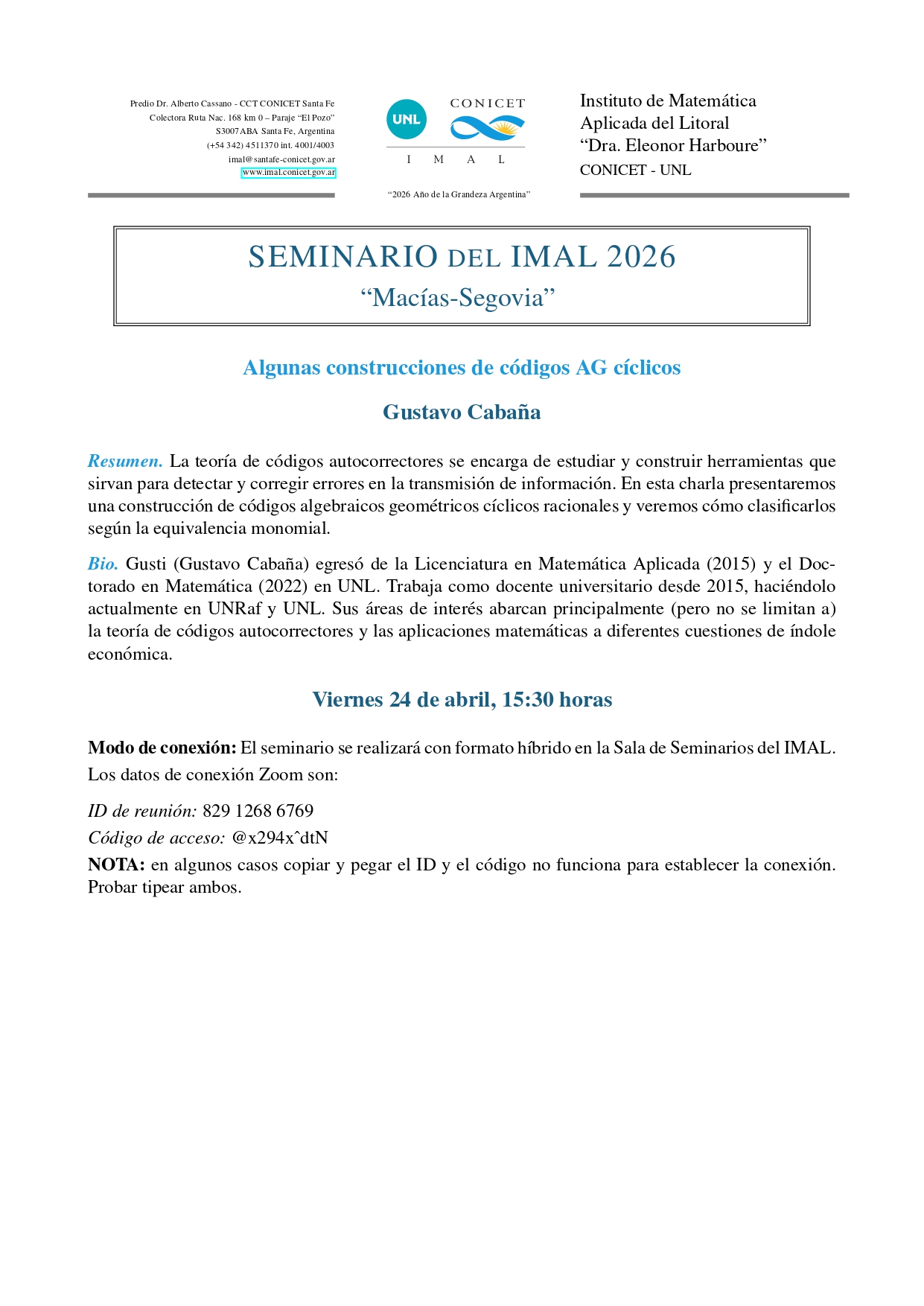 Modo de conexión: El seminario se realizará con formato híbrido en la Sala de Seminarios del IMAL.