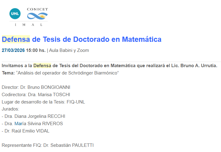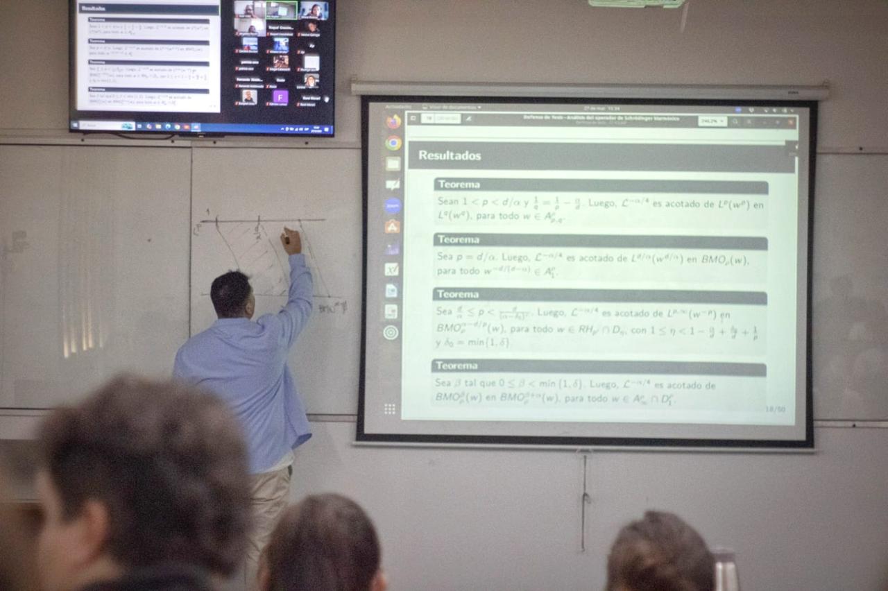El pasado 27 de marzo en el Aula Babini de la FIQ, el Lic. Bruno A. Urrutia realizó la defensa de su tesis de Doctorado en Matemática titulada “Análisis del operador de Schrödinger Biarmónico”.