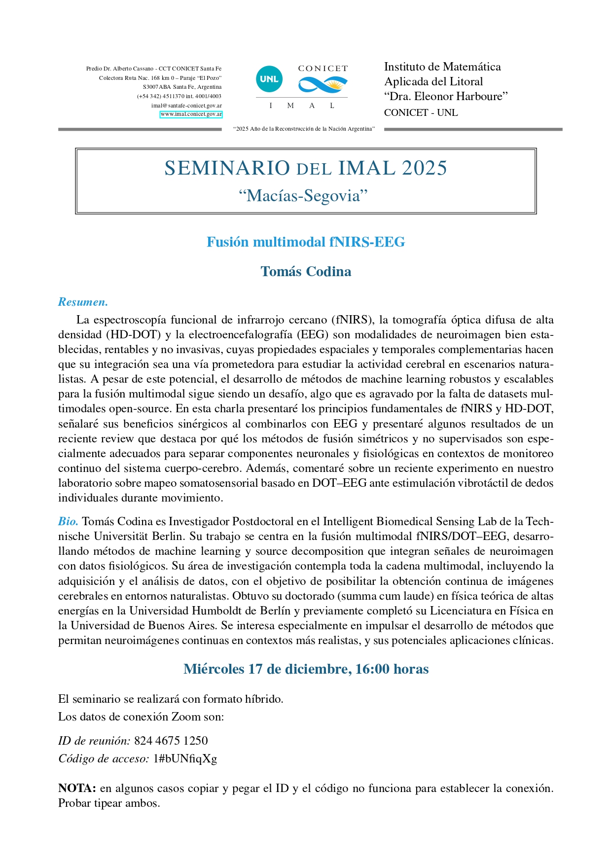 Biografía del Orador. Tomás Codina es Investigador Postdoctoral en el Intelligent Biomedical Sensing Lab de la Technische Universität Berlin. Su trabajo se centra en la fusión multimodal fNIRS/DOT–EEG, desarrollando métodos de machine learning y source decomposition que integran señales de neuroimagen con datos fisiológicos. Su área de investigación contempla toda la cadena multimodal, incluyendo la adquisición y el análisis de datos, con el objetivo de posibilitar la obtención continua de imágenes cerebrales en entornos naturalistas. Obtuvo su doctorado (summa cum laude) en física teórica de altas energías en la Universidad Humboldt de Berlín y previamente completó su Licenciatura en Física en la Universidad de Buenos Aires. Se interesa especialmente en impulsar el desarrollo de métodos que permitan neuroimágenes continuas en contextos más realistas, y sus potenciales aplicaciones clínicas.