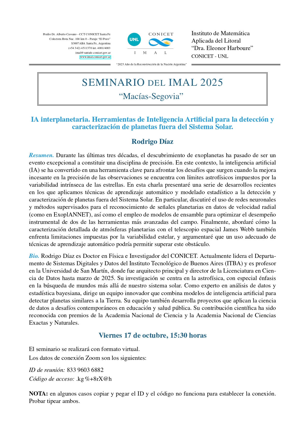 Resumen. Durante las últimas tres décadas, el descubrimiento de exoplanetas ha pasado de ser un evento excepcional a constituir una disciplina de precisión. En este contexto, la inteligencia artificial (IA) se ha convertido en una herramienta clave para afrontar los desafíos que surgen cuando la mejora incesante en la precisión de las observaciones se encuentra con límites astrofísicos impuestos por la variabilidad intrínseca de las estrellas. En esta charla presentaré una serie de desarrollos recientes en los que aplicamos técnicas de aprendizaje automático y modelado estadístico a la detección y caracterización de planetas fuera del Sistema Solar. En particular, discutiré el uso de redes neuronales y métodos supervisados para el reconocimiento de señales planetarias en datos de velocidad radial (como en ExoplANNET), así como el empleo de modelos de ensamble para optimizar el desempeño instrumental de dos de las herramientas más avanzadas del campo. Finalmente, abordaré cómo la caracterización detallada de atmósferas planetarias con el telescopio espacial James Webb también enfrenta limitaciones impuestas por la variabilidad estelar, y argumentaré que un uso adecuado de técnicas de aprendizaje automático podría permitir superar este obstáculo.