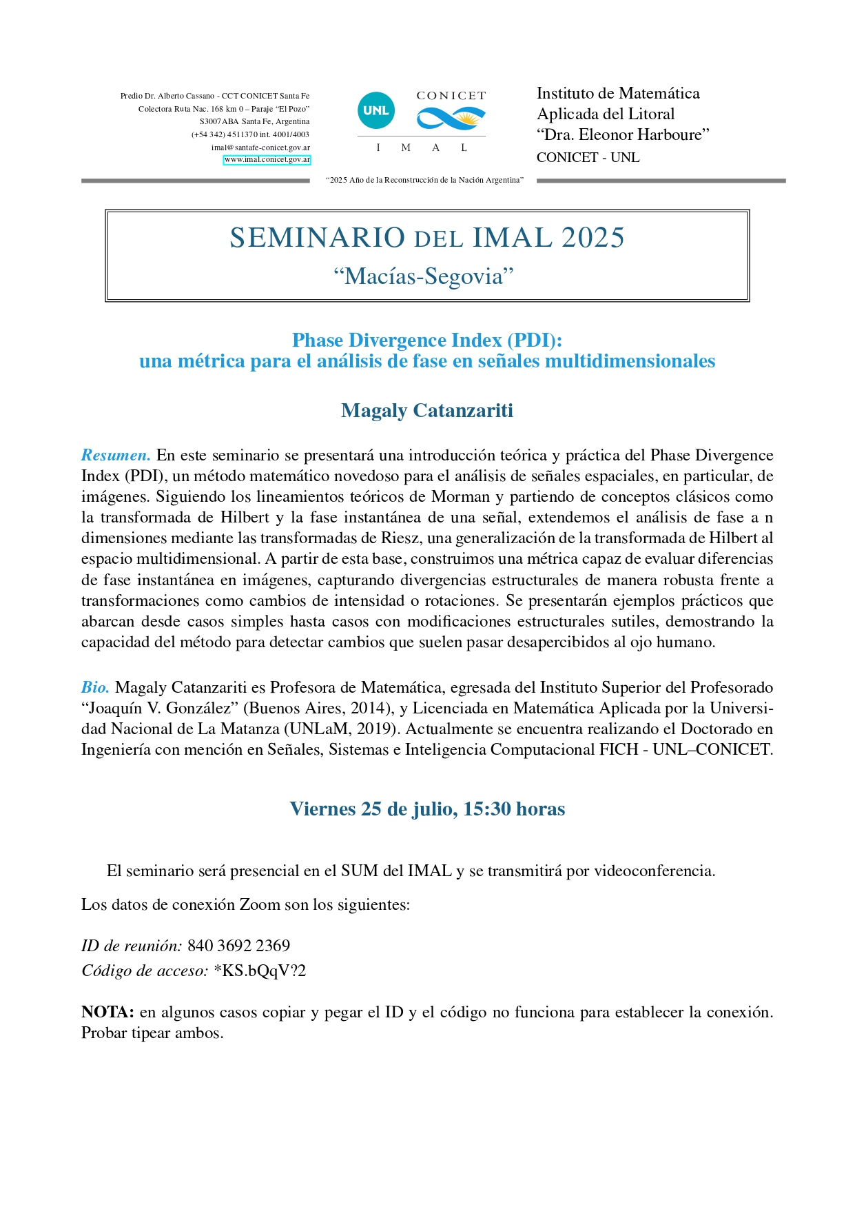El seminario será presencial en el SUM del IMAL y se transmitirá por videoconferencia.