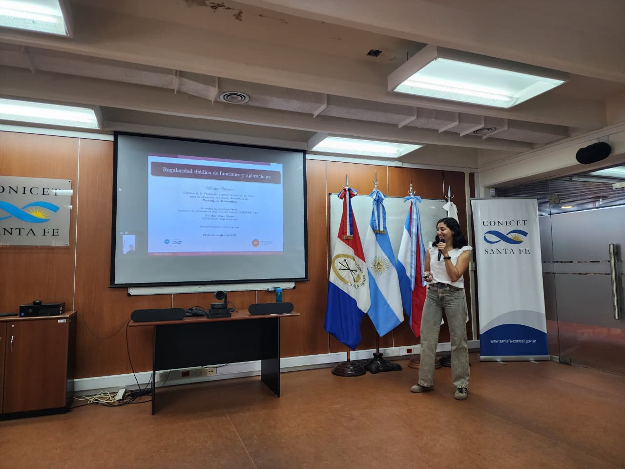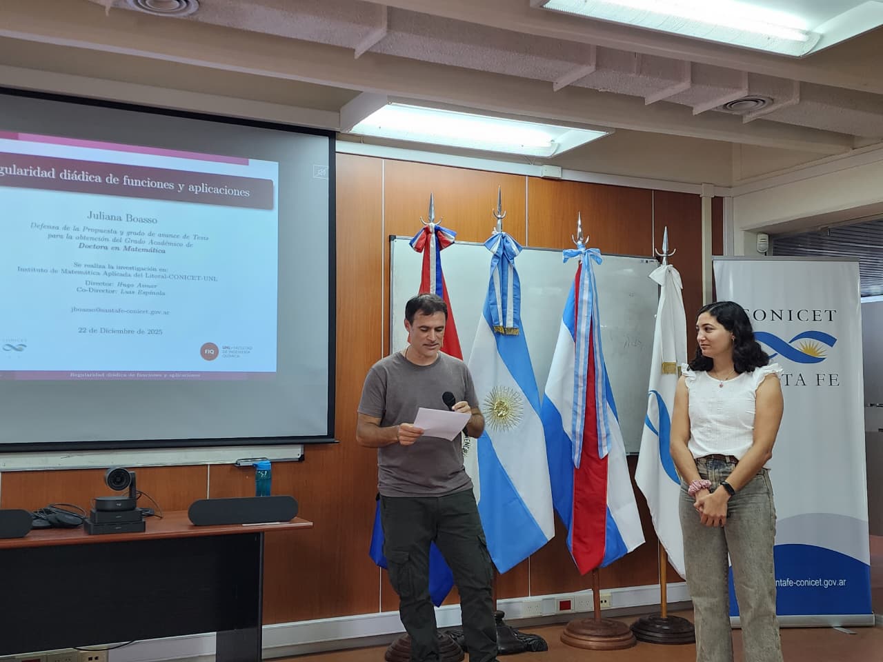 La Defensa de la Propuesta y Grado de Avance de la Tesis de Juliana Boasso en el tema "Regularidad diádica de funciones y aplicaciones" se realizó el lunes 22 de diciembre de 2025 en la Sala de Capacitación del CCT CONICET Santa Fe. El jurado estuvo conformado por el Dr. Ignacio García del IFIMAR (UN Mar del Plata, CONICET), el Dr. Mauricio Ramseyer del IMAL (UNL, CONICET) y en modalidad de videoconferencia la Dra. Patricia Morillas de IMASL (UNSL, CONICET). El Director de la Tesis es el Dr. Hugo Aimar del IMAL y Luis Espínola del INALI su Codirector. Juliana Boasso se graduó de Profesora en Matemática de la UNL, es Becaria Doctoral de CONICET en el IMAL y JTP en la FBCB de la UNL.